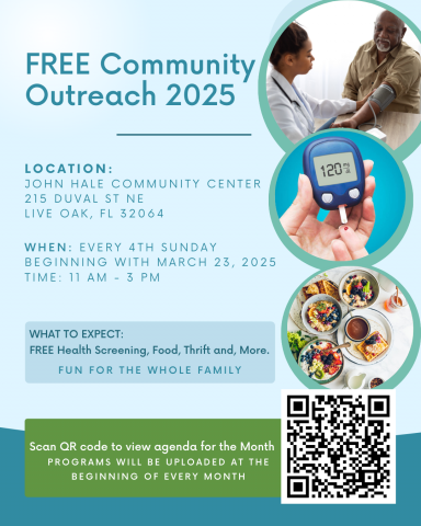 Join us every 4th Sunday of the month at the John Hale Community Center in Live Oak, FL, from 11:00 AM to 3:00 PM for our Community Outreach Event. This event offers free health checks and serves as an opportunity to prioritize your well-being, learn practical skills, and connect with others in a welcoming environment.